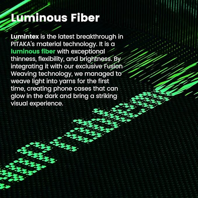 vcLumintex™ Technology Lumintex™ is another breakthrough in PITAKA's material technology. By skilfully blending luminous materials with aramid fibers, we craft striking phone cases that glow in the dark. It's a bold statement of technology and fashion.