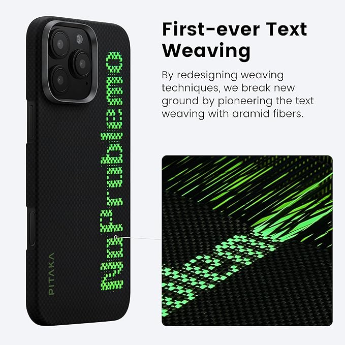 First-Ever Text Weaving PITAKA breaks new ground by pioneering the first-ever text weaving with aramid fibers. By redesigning weaving techniques, we seamlessly weave text on phone cases, expressing our unique attitude through new designs.